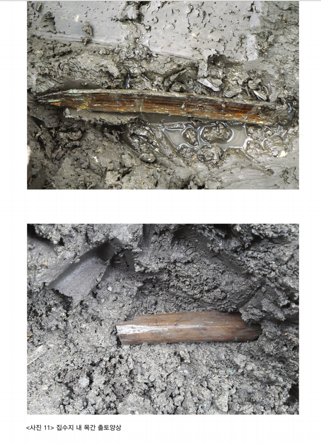 5. 이번 조사에서 김해 봉황동 저습지유적에 이어 두 번째로 목간이 조사되었다. 봉황동 저습지 유적에서는 논어의 구절이 4면에 적힌 목간 1점이 출토되었다. 양동산성 집수지에서는 1면에만 묵서한 목간 3점이 출토되었으며 1점이 묵서가 희미하게 남아 있다. 보존처리 후 목간 내용을 판독한 결과 辛卯年十月栗村爲(百)□□□麦石으로 관찰되며, 양동산성으로 운송한 곡물 꾸러미에 부착된 짐 꼬리표로 확인되었다. 점 꼬리표에 적혀있는 글자의 기재 방식이 마을이름+사람이름+곡물이름 순으로 적은 함안 성산산성 부엽층에서 출토된 목간의 기재 방식과 비슷하다. 또한 양동산성에 적힌 '栗村" 이라는 마을 이름이 함안 성산산성에서도 발견되었으므로 두 유적의 목간을 검토하여 연구할 필요가 있다.